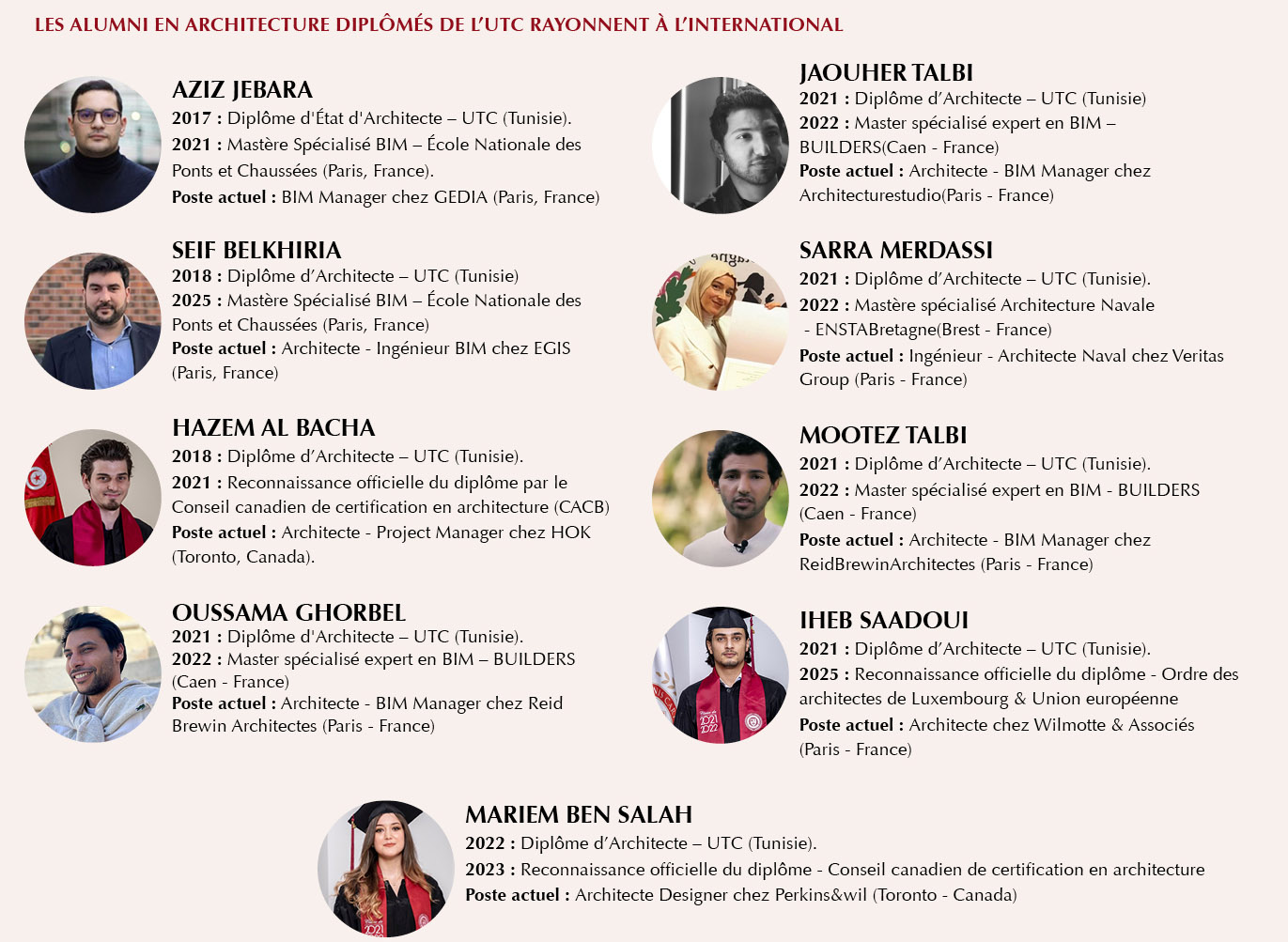Grâce à des partenariats de prestige, comme le double diplôme Architecte / Mastère BIM avec BUILDERS École d’Ingénieurs (France) ou le Mastère en Architecture d’Intérieur reconnu en France par le Répertoire National des Certifications Professionnelles, l’école offre un accès mondial. La reconnaissance du diplôme de l’UTC, l’inscription de Hazam Albacha (diplômé en 2018)  à l’ordre des architectes du Canada ainsi que son intégration au cabinet international HOK en tant que Project Manager, en est l’éclatante preuve.