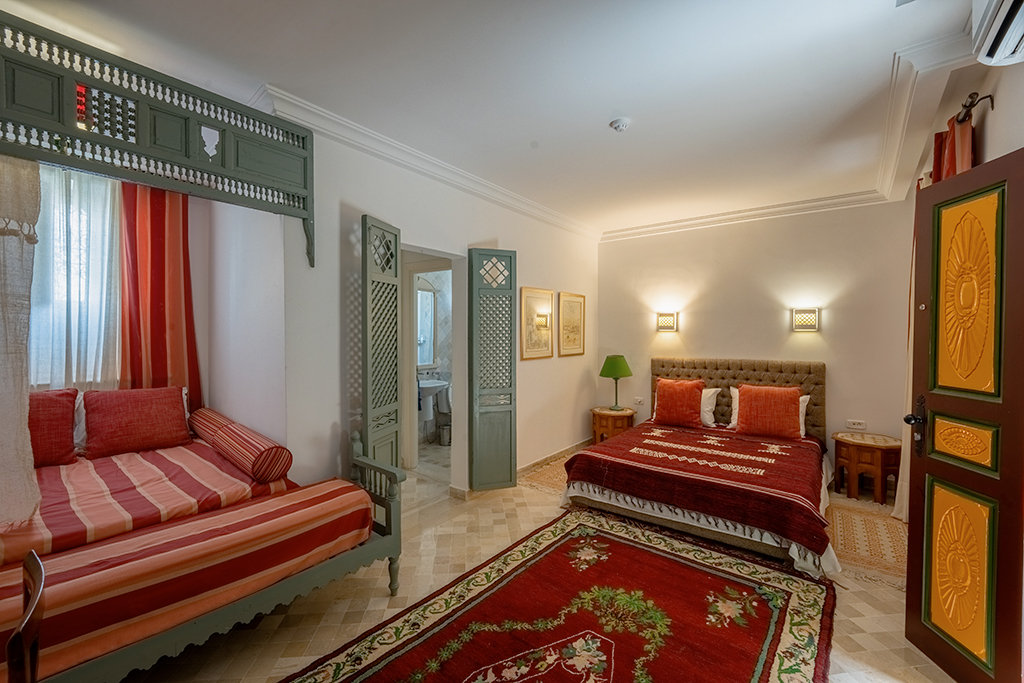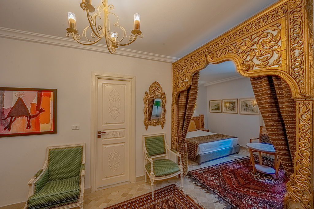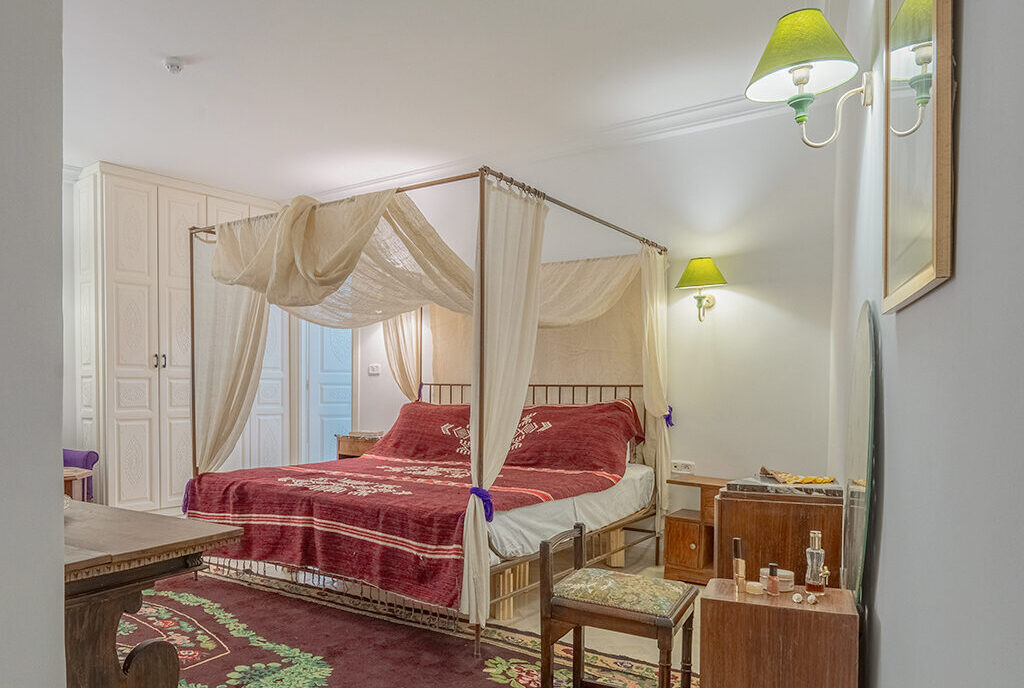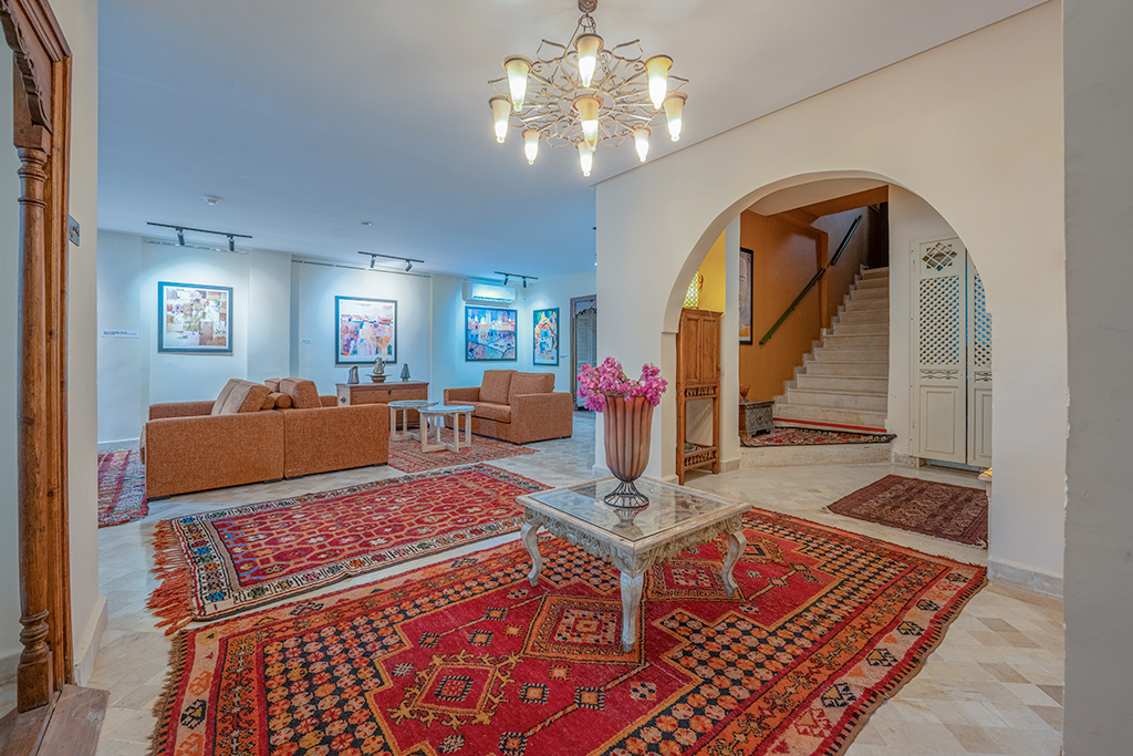 Par ailleurs, entrer à Dar Dhiafa Paul Klee, c’est franchir le seuil d’une œuvre. Chaque chambre est différente, avec ses tapis anciens et ses objets uniques. Certaines chambres rappellent des maksouras, d’autres évoquent les patios mystiques de la médina.