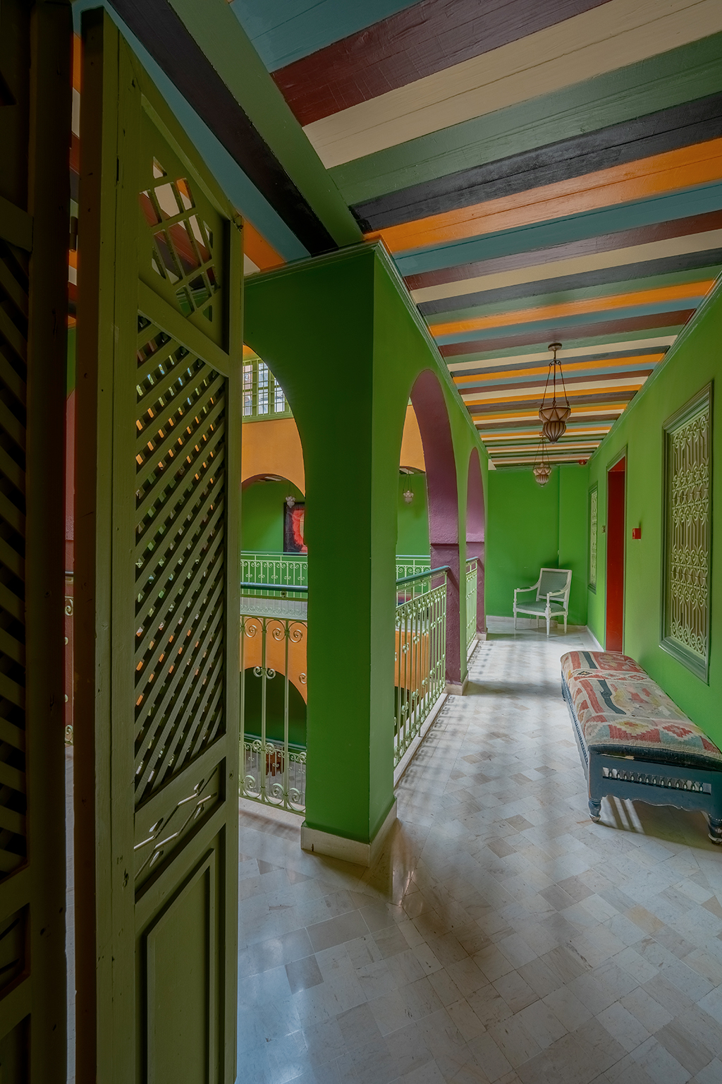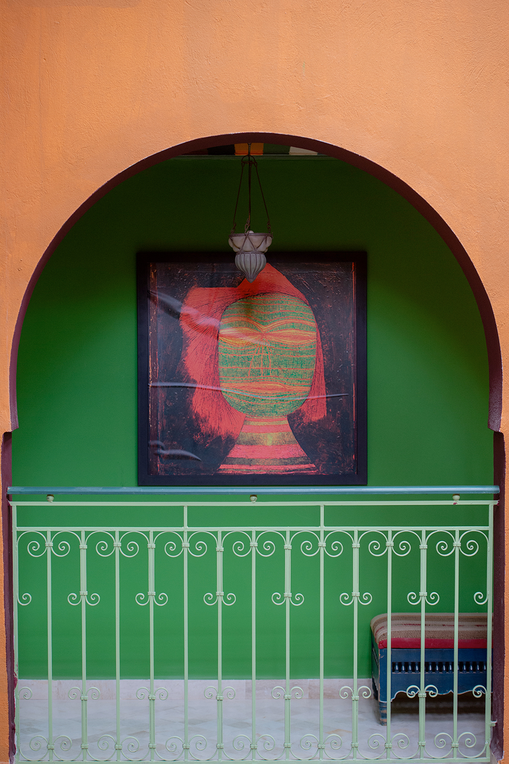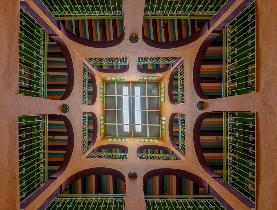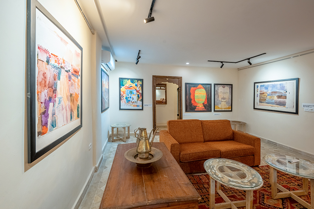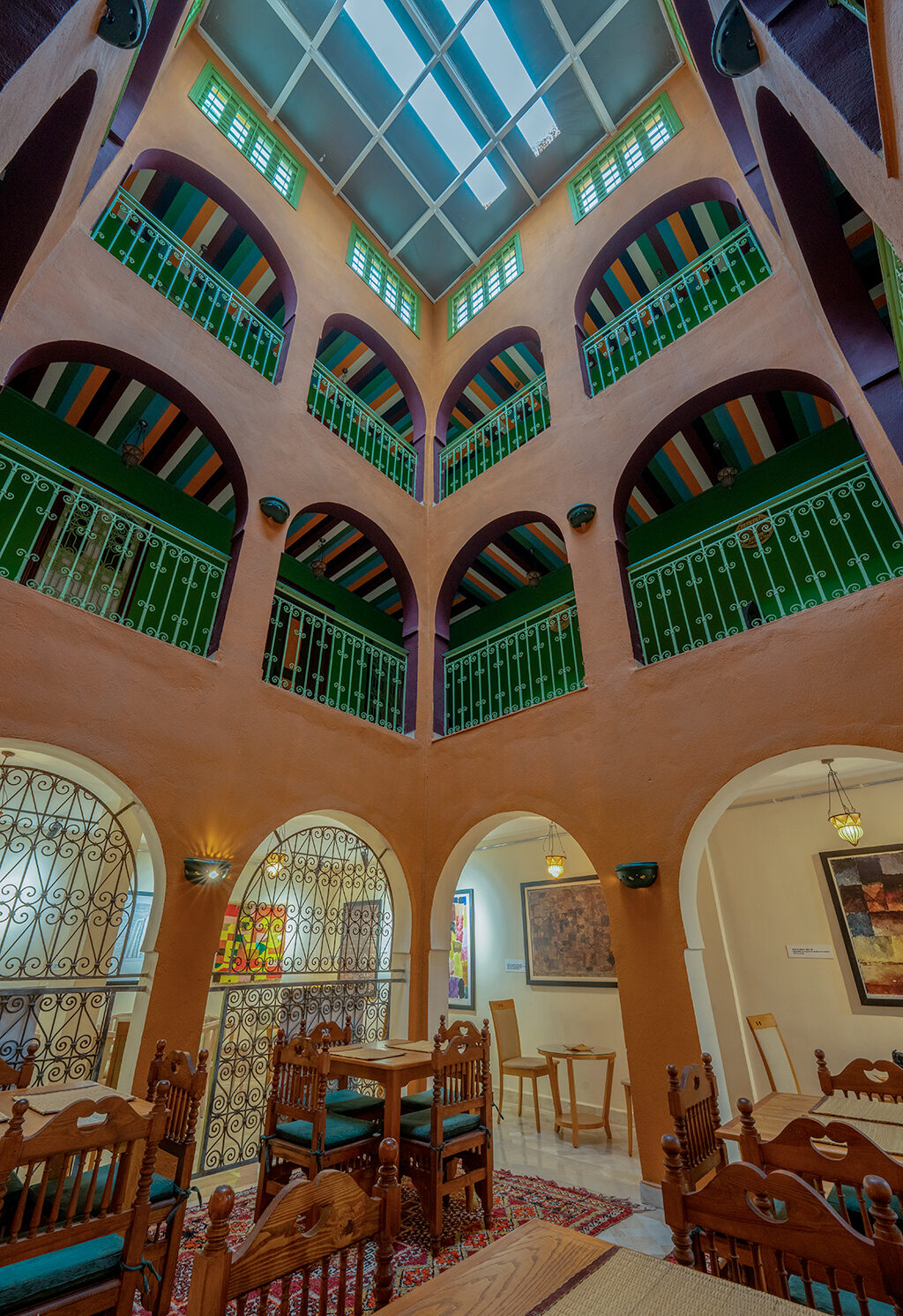 De là naît l’idée : faire de Dar Dhiafa un hommage vivant à Klee. Une galerie permanente est conçue au cœur de l’hôtel, avec des reproductions, des textes, mais surtout une atmosphère. Les murs en aplats de couleurs, les plafonds tressés, les portes en bois teinté évoquent l’aquarelle et la lumière de Kairouan. On ne décore pas : on crée une expérience sensorielle, presque mystique.